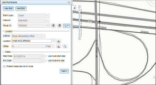 Characteristics of a route, such as crashes and traffic count sites, can be represented as a point event offset from an existing point feature class. The Point Events widget provides an interface to add point events into the geodatabase. The referent offset data is translated to routes and measures for storage.